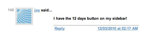Congrats to the winners! Thank you for introducing us to so many talented women. The twelve days was very fun!!!