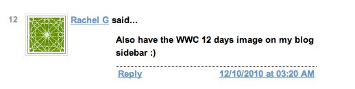 I can’t believe that I’m one of the lucky winners – and what a great prize (exactly my colors!!!!) Thank you to Meg from Brassy Apple and a HUGE thanks to WWC for hosting such a great 12 Days! Congrats to all of the winners and thank you to all of the artists for sharing their stories with us. Merry Christmas everyone!